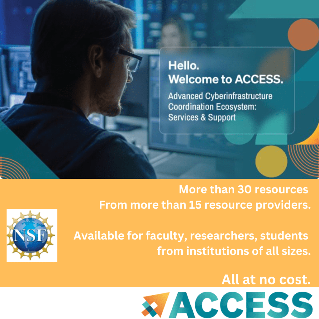 ACCESS is a program established and funded by the U.S. National Science Foundation to help researchers and educators, with or without supporting grants, to utilize the nation’s advanced computing systems and services – at no cost to you.